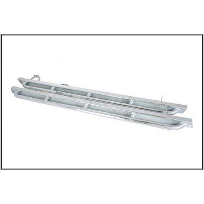 Terrafirma rock sliders to suit a Defender 110 made from black powder coated 80 x 40 x 3mm thick steel box section with 42.5 x 3mm wall thickness tubular tree bars welded to the sides. All fixings are heavy duty.The rock sliders with tree bars are designed to offer maximum protection for the sides of a Defender, intended to keep the body work well away from the ground and from trees & rocks while driving off road.These rock sliders require the removal of the existing aluminum sill under the doors.